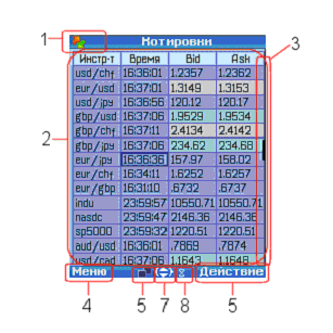 В мобильном терминале таблицы используются для отображения данных котировок, открытых, закрытых позиций, новостей, выставленных ордеров, их истории и текущего состояния счета.