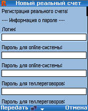 Для того чтобы начать работу в мобильном терминале, необходимо ввести ваш логин в системе и пароль. Если у вас уже есть логин и пароль, например, полученные при использовании клиента на настольном компьютере, вы можете ими пользоваться. Если нет, то вам нужно получить их. Это бесплатная и быстрая процедура, которая описана в разделах «Регистрация демонстрационного счета» и «Регистрация реального счета».