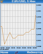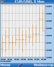 Выбор индикатора осуществляется нажатием на кнопку «Индикаторы» в окне графиков правой софт-клавишей мобильного телефона. Из появившегося меню вы можете выбрать нужный индикатор, или же изменить параметры текущего индикатора с помощью пункта меню «Параметры».