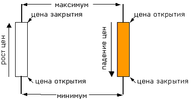 Черта справа указывает уровень цены, который существовал на момент окончания периода (например, определенного часа) и называется ценой закрытия (close).