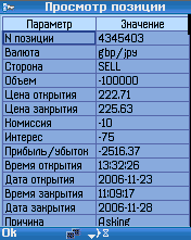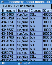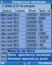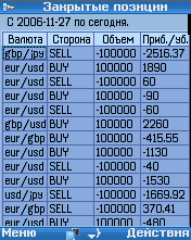 Как и в таблице «открытые позиции», здесь можно полностью просмотреть отдельную закрытую позицию или все закрытые позиции сразу. Для этого используется меню «Действия», вызываемое при нажатии правой софт-кнопки: