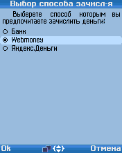 Выбрав нужный способ (на иллюстрации это Webmoney), нажмите левую софт-клавишу телефона и следуйте дальнейшим инструкциям.