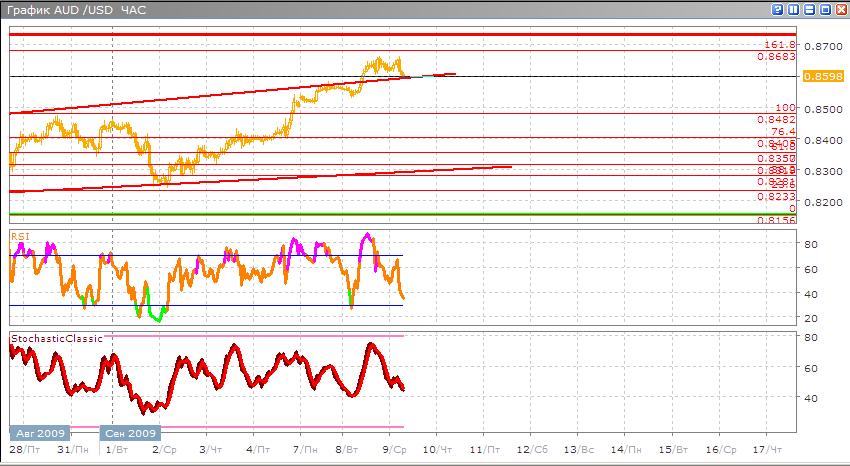 Австралийский доллар пробил канал роста в котором находился, хоть это и стало возможно, но этот канал его линия поддержки остается довольно сильной на этот день и вряд ли будет пробита в ближайшее время. Эта валюта пройдя довольно долгий путь роста, оставляет за собой еще некоторый потенциал роста. Она совсем чуть-чуть не дойдя до уровня в 161,8% откатилась. Откат будет в течение всего дня скорее всего будет продолжен. На это также указывают и другие индикаторы технического анализа это Stohastic и RSI которые это направление подтверждают. Линии поддержки и сопротивления остаются те же в силе. Ожидая также получения экономических новостей, которые могут подтвердить намеченную динамику, или ее немного скорректировать.