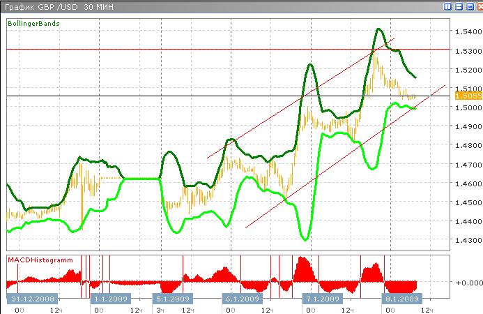 Ясно виден ступенеобразный подъем. На данный момент пара претерпела очередную коррекцию и, судя по индикатору Боллинжера, должна вскоре возобновить рост и через несколько часов достигнуть уровня сопротивления 1.5300(2-недельный максимум) и пробить его. Это тем более вероятно, что сегодня выходят важные экономические данные в США, и вряд ли они окажутся такими уж оптимистичными. Впрочем, сегодня так же будет объявлено решение по процентной ставке Банка Англии, которое может пошатнуть позиции фунта.