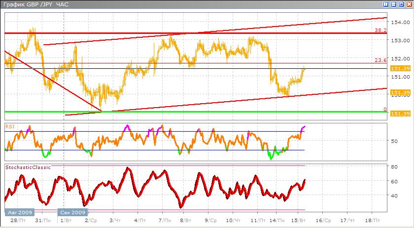 Валюта находится в восходящем канале и двигается к отметке в 38,2% по Фибоначчи. Псоле закончившегося нисходящего движения в данный момент идет коррекционное. Возможно, что валюта дойдет до уровня в 50% по Фибоначчи, но это в среднесрочной перспективе. В данный момент восходящее движение не до конца сформировано, по RSI вот-вот рост будет закончен, а по Stohastic-у движение восходящее не было до конца сформировано. Необходимо ожидать более точных сигналов.