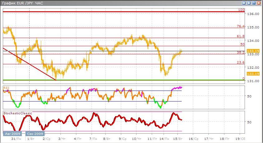 Данная валюта после отскока от сильного уровня 61,8% по Фибоначчи, откатилась к линии поддержки, сейчас на находится на уровнях между 38,2 и 50%. Скорее всего она упрется в тоже довольно сильный уровень в 50% и пойдет снова вниз. По другим индикаторам технического анализа сейчас намечается явный разворот в сторону продажи данной пары. RSI находится в зоне перекупленности и совершает разворот в сторону продажи, тоже самое совершает и Stohastic. Данный откат будет проходить до уровней 23,6% по Фибоначчи.
