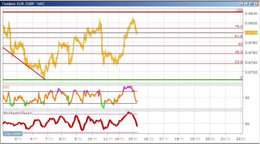 Коридор расширяющийся в котором находилась данная валюта был ей пробит. Валюта совершает сильные как восходящие, так и нисходящие движения от уровней 23,6 до 100% по Фибоначчи. Сейчас находится в районе между уровнем 76,4 и 61,8%. Направление движение скорее всего продолжится вниз до 61,8 и 50 %, но в дальнейшем также ожидается и рост к тем же самым уровням это 76,4 и 100%. Классические индикаторы на данный момент показывают продажу данной валюты RSI вышел из зоны перекупленности и завершает разворот продажи, а Stohastic продолжает после пересечения быстрой скользящей с медленной продолжает движение вниз.