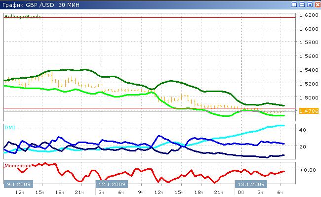 Индикаторы показывают сильный нисходящий тренд в связи с тем, что фунт упал против доллара с 1.4820 до 1.4681, однако кривые ADX и DI- выказывают намерения начать снижение, так что ситуация может измениться. Если фунт начнёт падать, то следующим уровнем поддержки, видимо, станет 1.4750, а в случае роста, который, однако, маловероятен, пара может достигнуть уровня начала дня, или внутридневного максимума (1.4832). Скорость изменения цены так же мала.