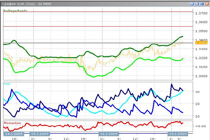 Евро растёт против доллара с утра, начав день с 1.3278. Сейчас единая европейская валюта торгуется вблизи уровня 1.3350. Индикатор среднего направленного движения показывает усиливающийся тренд: ADX растёт и уже почти достиг отметки 30, DI+ превышает 30. Есть основания полагать, что в течение дня продолжится рост валюты против доллара, и следующим уровнем для пары в случае такого роста может стать отметка 1.3400-1.3450. Скорость изменения цен относительно велика, согласно индикатору момента.