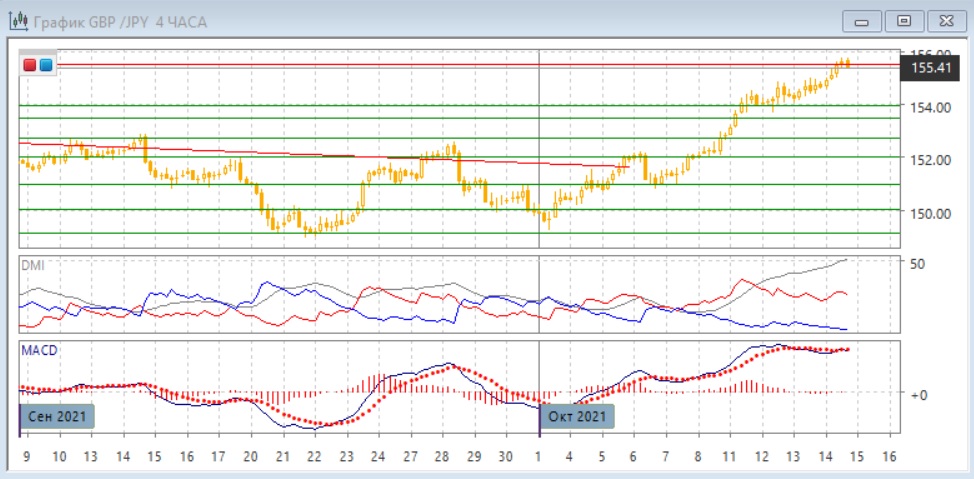 На четырёхчасовом графике рост остаётся сильным, но и видно и замедление: образовалось медвежье расхождение максимумов пары и гистограммы MACD. Вместе к приближением к сильному сопротивлению на максимумах мая и июня это увеличивает вероятность коррекции. В этом масштабе существенной коррекции не было с уровня 151,00 - таким образом, волна роста без заметных откатов достигла 450 пунктов, что много для этого масштаба. По ADX тенденцией является рост: превышение DM+ над DM- очень большое и устойчивое при высоком и растущем уровне ADX.