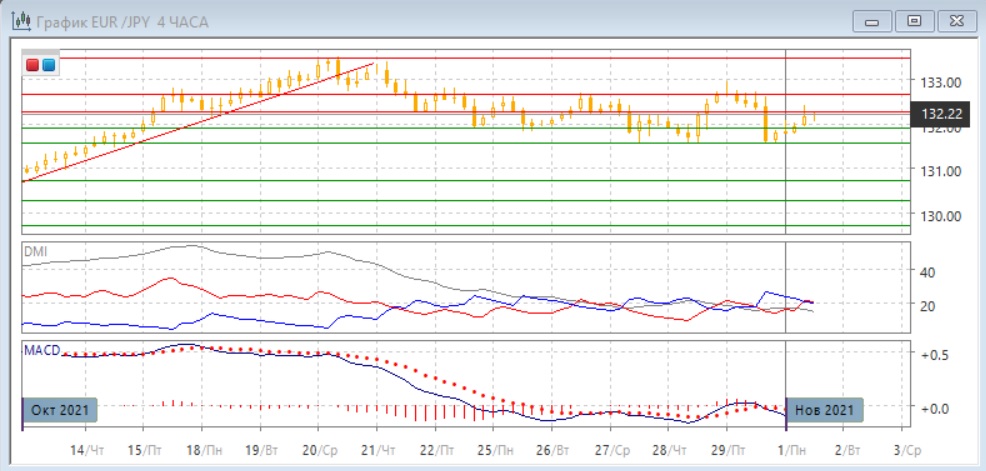 На четырёхчасовом графике диапазон 131,90-132,50 можно расширить, учитывая недавние колебания, до 131,60-132,70. Пара вернулась в середину диапазона, и так как она приблизилась к верхней границе 132,70, в рамках движения в диапазоне более вероятно снижение к нижней границе. По индикаторам направленного движения в этом масштабе пара во флэте: DM+ и DM- пересекаются, ADX на относительно низком уровне, гистограмма MACD остаётся около нуля. Так как пребывание пары относительно узком диапазоне занятулось, при выходе из него движение может быть относительно сильным.