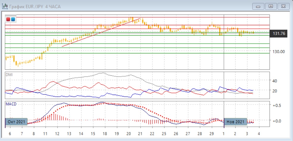 На дневном графике пара осталась в консолидации, её границы можно расширить до 131,60-132,50. То, что пара осталась выше минимумов предыдущих свечей у 131,60, и не продолжила снижение после образования относительно широкодиапазонной свечи 29 октября, является бычьим сигналом, как и нижние тени последних свечей (без учёта 29 октября, так как тогда был конец месяца). Исходя из движения в диапазоне, более вероятен рост пары к верхней границе на 132,50. Более сильное движение, вероятно, будет в сторону выхода пары из консолидации. По индикаторам направленного движения сохраняется коррекция к росту: превышениe DM+ над DM- остаётся большим, при высоком уровне ADX. Коррекция видна по снижению гистограммы MACD уже в отрицательной зоне и небольшому отрицательному наклону линии MACD.