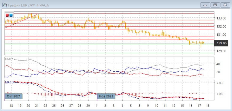 На четырёхчасовом графике происходит консолидация выше уровня 129,70. Прокол уровня в начале 17 ноября может быть бычьим признаком, так как может сталь ложным пробоем. Кроме этого, стабилизация сама по себе увеличивает вероятность отскока вверх. Тем не менее, отсутствие этого отскока после восстановления выше 129,70 может быть медвежьим сигналом. Последовательность снижения относительных максимумов и минимумов пары сохраняется. По ADX в этом масштабе снижение хорошо выраженное: превышение DM- над DM+ большое и устойчивое при высоком уровне ADX. Дальнейшее движение скорее будет в сторону выхода за пределы 129,70-131,30.