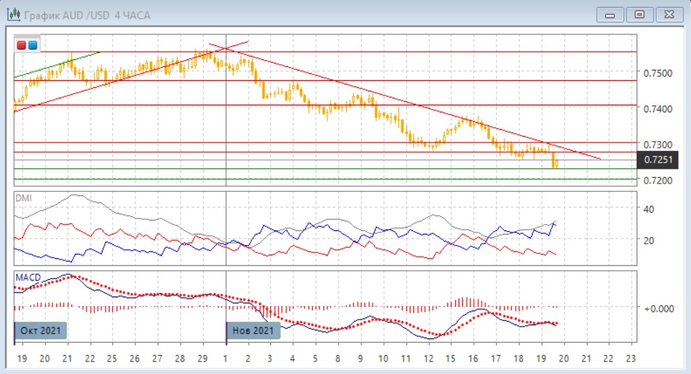 На четырёхчасовом графике пара остаётся ниже линии нисходящего тренда с начала ноября, при отскоке вверх она снизилась от пересечения линии тренда и уровня сопротивления 0,7300. Как и на дневном графике, видно замедление снижение: новые минимумы пары не подтверждают минимумами гистограммы AMCD. Однако пока тенденция сохраняется, и после снижения от 0,7300 снижение в краткосрочной перспективе является предпочтительным.