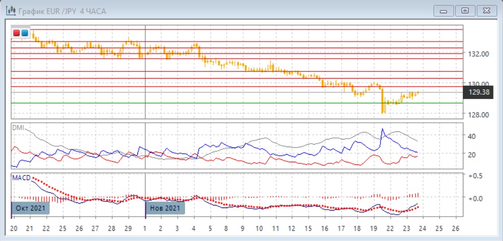 На четырёхчасовом графике изменение в том, что последовательность снижения относительных минимумов нарушена. Уровень 128,70 выступил 19-22 ноября уже поддержкой для пары. По времени размер волны роста сейчас намного больше волны снижения. Отсутствие продолжения сильного движения в пятницу может быть бычьим сигналом в этом масштабе. Также краткосрочное снижение ниже 128,70 можно рассматривать как ложный пробой уровня. Преодоление уровня 129,70 скорее обозначило бы локальный разворот (более сильное сопротивление чуть выше на 130,00-130,30.