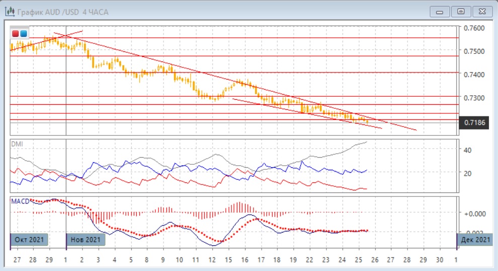 На четырёхчасовом графике пара находится у узком нисходящем клине, верхней границей которого является линия тренда с начала ноября. Хотя тенденция снижения сейчас хорошо выражена, в этом масштабе снижение является уже слишком длительным. С 15 ноября не было заметных отскоков вверх. Образовалось очередное бычье расхождение минимумов пары и гистограммы MACD. Это говорят о замедлении снижения и увеличении вероятности разворота. Однако это сигнал не получает подтверждения, которым могло бы быть преодоление линии тренда. Преодоление "круглого" уровня 0,7200 может открыть пространство для дальнейшего снижения в краткосрочной перспективе. По ADX тенденция снижения является очень сильной: превышение DM- над DM+ большое и устойчивое при высоком уровне ADX. Если пара восстановится выше уровня 0,7200 (и, таким образом, преодолеет линию тренда), это изменило бы картину.