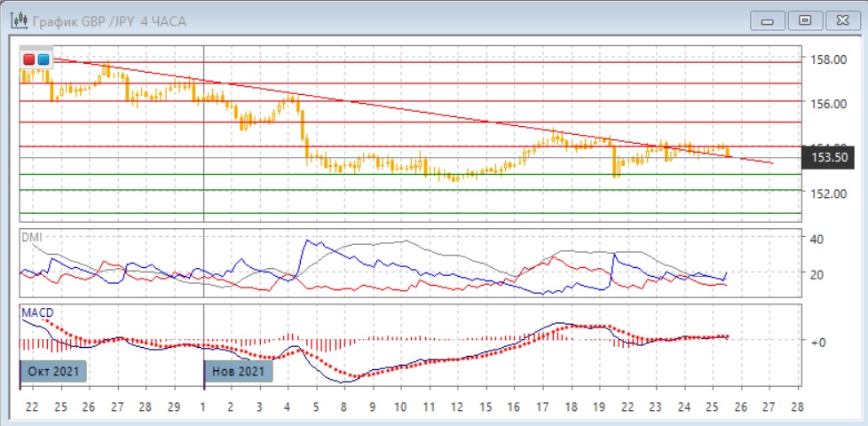 На четырёхчасовом графике тестирование уровня сопротивления 154,00 было неудачным и оно затянулось. Это увеличивает вероятность отката вниз от уровня сопротивления, при этом целью виделся бы уровень сопротивления на 152,70. По индикаторам направленного движения флэт: DM- и DM+ близки, гистограмма MACD около нулевого уровня, линия MАCD близка к горизонтали.