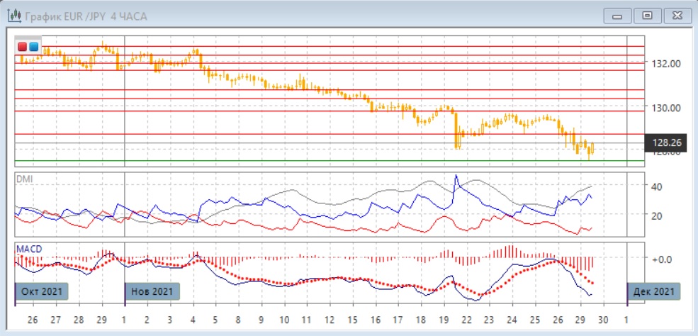На дневном графике пара ещё раз протестировала уровень поддержки 128,00, около минимумов августа, сентября и середины ноября. Закрытие в пятницу было ниже этого уровня, но учитывая сокращённый день на рынке в США это может быть ложным сигналом. Для дальнейшей перспективы важно, закрепится ли пара ниже 128,00 (таким образом, сильная поддержка была бы преодолена), или восстановится (тогда может рассматриваться ложный пробой). Образовалось ещё одно бычье расхождение минимумов пары и гистограммы MACD, что укрепляет поддержку на 128,00. Однако широкодиапазонная свеча в пятницу является медвежьим сигналом - импульс может сохраниться. По индикаторам направленного движения тенденция снижения сильная: превышение DM- над DM+ большое при высоком уровне ADX, гистограмма MACD находится в отрицательной зоне, линия MACD имеет отрицательный наклон.