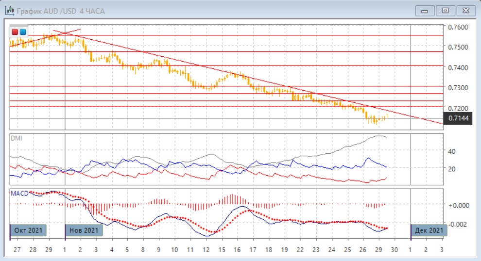 На дневном графике пара продолжила снижение, приблизившись к следующему "круглому" уровню 0,7100. Важное изменение состоит в преодолении уровня поддержки на минимуме конца сентября, что делает следующем поддержкой зону из "круглого" уровня 0,7100 и находящегося рядом минимума августа. Пара остаётся ниже линии тренда с начала ноября. Образование широкодиапазонной свечи снижения в пятницу является медвежьим сигналом, так как сильный импульс может продолжиться. По индикаторам направленного движения тенденция снижения является сильной: превышение DM- над DM+ большое, ADX на высоком уровне, гистограмма MACD находится в отрицательной зоне, линия MACD имеет отрицательный наклон. Образовалось бычье расхождение минимумов пары и гистограммы MACD, но это сигнал пока не имеет подтверждения. Открытие с разрывом вверх может быть сейчас бычьим сигналом, так как это произошло перед сильным уровнем поддержки. Пока продолжение снижения остаётся предпочтительным, но разворот назревает, так как текущая волна снижения продолжается уже 550 пунктов.