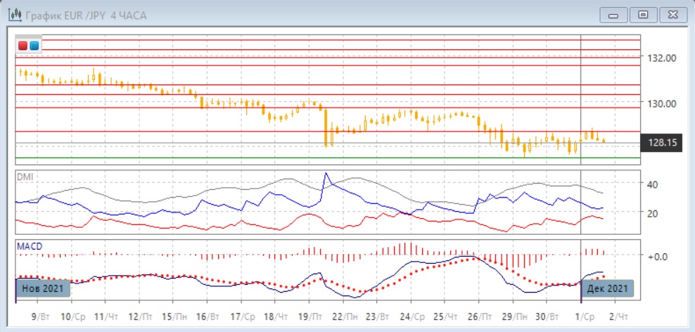 На дневном графике пара осталась выше уровня поддержки 128,00, около минимумов августа, сентября и середины ноября. Итог тестирования этого уровня ещё не подведён: с одной стороны. устойчивость пары и отсутствие закрытий ниже 128,00, нижние тени свечей, отсутствие продолжения снижения после образования широкодиапазонной свечи 26 ноября являются бычьими сигналами. С другой стороны. пара не преодолела ближайшее сопротивление на 128,70 и этот уровень остаётся сопротивлением. Сохраняется бычье расхождение минимумов пары и гистограммы MACD, что укрепляет поддержку на 128,00. Подтверждением этого сигнала может быть преодоление уровня 128,70. По индикаторам направленного движения тенденция снижения остаётся сильной: превышение DM- над DM+ большое при высоком уровне ADX, гистограмма MACD находится в отрицательной зоне, линия MACD имеет отрицательный наклон.