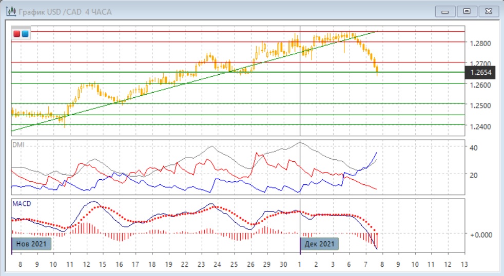 На дневном графике произошло существенное изменение: после закрытий ниже линии тренда , пара резко снизилась. При этом были преодолены "круглые" уровни 1,2800 и 1,2700. Образование широкодиапазонной свечи во вторник может предполагать продолжение снижения - сильный импульс обычно продолжается, а в данном случае отката давно назрел. Сейчас пара находится у поддержки на минимуме в конце ноября около 1,2650. Более сильная поддержка может быть у следующего "круглого" уровня 1,2600. По индикаторам направленного движения тенденция может измениться: DM+ и DM- сближаются, гистограмма MACD снижается уже в отрицательной зоне Л линия MACD разворачивается.