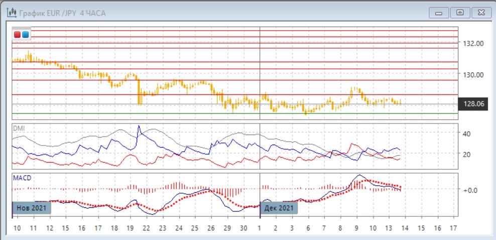 На дневном графике пара остаётся в диапазоне 127,50-128,70. Восстановление выше уровня 128,00 можно рассматривать как бычий сигнал, так как пара, таким образом, оказывается выше минимумов августа и сентября. Потенциально снижение ниже 128,00 в конце ноября - начале декабря может стать ложным пробоем. Однако для такой картины необходимо, чтобы пара удерживалась выше 128,00. Если пара останется выше 128,00, также образуется более высокий, чем предыдущий, относительный минимум - вместе с образованием более высокого максимума это может быть признаком разворота. По индикаторам направленного движения коррекция к снижению: превышение DM- над DM+ сохраняется, но гистограмма MACD находится в положительной зоне.