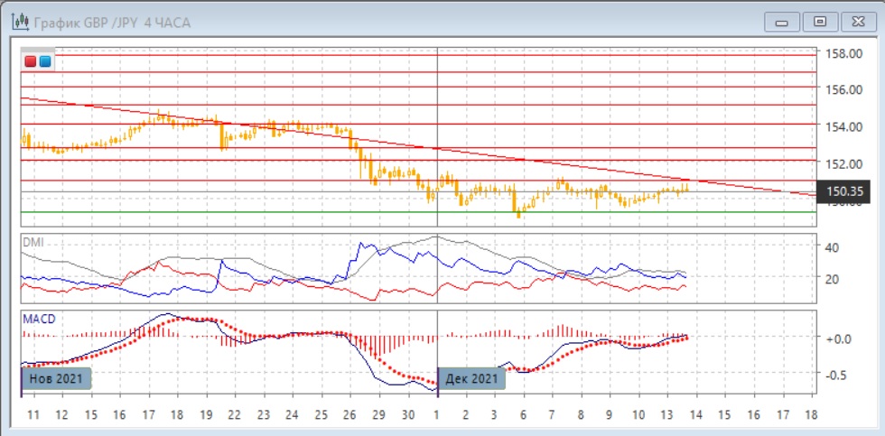 На дневном графике пара остаётся в диапазоне с конца ноября - выше ключевого уровня поддержки 149,25, но ниже сопротивления на 151,00. Постепенно пара приближается к выходу из этого диапазона, так как она приблизилась к линии нисходящего тренда, если строить его с октября. Тренд является медвежьим фактором, а сильный уровень поддержки на 149,25 - бычьим. Дальнейшее движение пары, вероятно, будет в сторону выхода либо выше линии тренда (что обозначило бы разворот), либо ниже уровня 149,25.