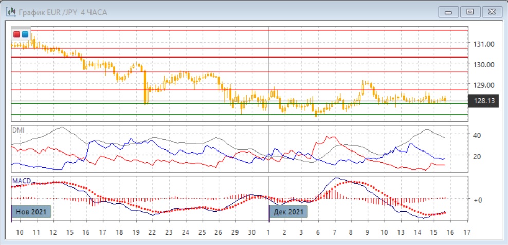 На четырёхчасовом графике пара остаётся в диапазоне 127,50-128,70 с конца ноября, и в верхней части этого диапазона (128,00-128,70) с 9 декабря. В рамках движения в диапазоне более вероятно движение к верхней границе, так как пара уже достигла нижней границы более узкого диапазона. Консолидация в верхней части более широкого диапазона и отсутствие движения к нижней границе после ложного пробоя 8-9 декабря увеличивают вероятность выхода пары из диапазона вверх.