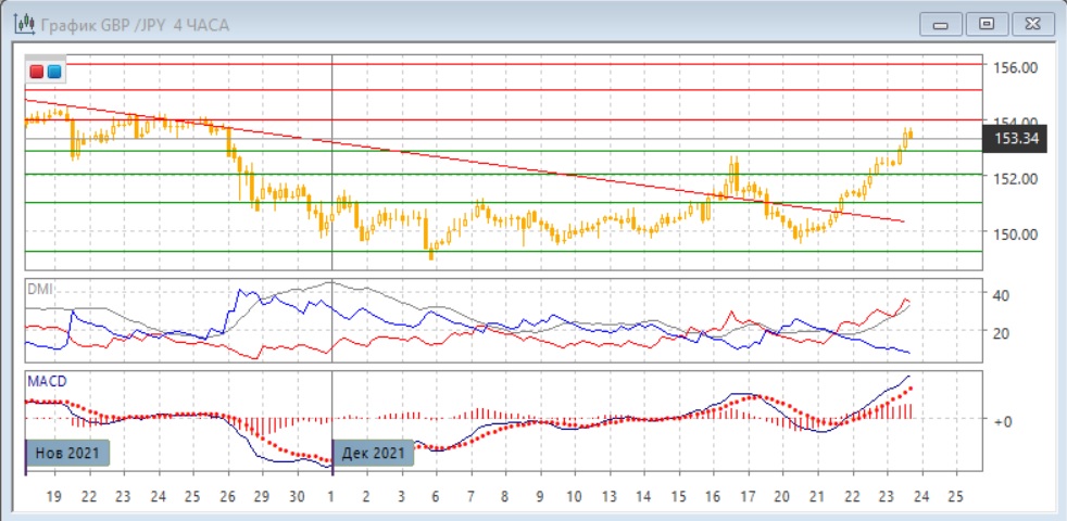На дневном графике пара быстро растёт после преодоления линии нисходящего тренда и уровня сопротивления 152,00. Пара приближается к сопротивлению на 154,00 где может встретить сопротивление. Однако учитывая, как сильно развивается прорыв уровня сопротивления, скорее рост будет продолжаться. Относительные максимумы и минимумы пары теперь последовательно растут. По индикаторам направленного движения тенденцией становится рост: DM+ выше DM-, гистограмма MACD растёт в положительной зоне, линия MACD развернулась.