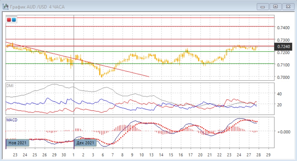 На четырёхчасовом графике происходит консолидация в узком диапазоне после выхода из диапазона 7-22 декабря вверх. Так как пара получила поддержку на ранее преодолённой верхней границе 0,7200, более вероятно, то пара выйдет из текущего узкого диапазона вверх с ближайшей целью на следующем "круглом" уровне 0,7300.