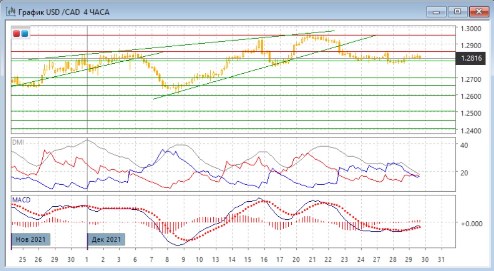 На четырёхчасовом графике продолжается консолидация в узком диапазоне 1,2800-1,2850. Так как в целом картина разворота (после преодоления линии восходящего тренда) остаётся действующей, более вероятен выход из диапазона вниз. По индикаторам направленного движения пара во флэте (что соответствует диапазону): DM+ и DM- близки, уровень ADX снизился, гистограмма MAD находится около нуля. Так как пара задержалась в узком диапазоне, при выходе из него можно ожидать ускорения движения.