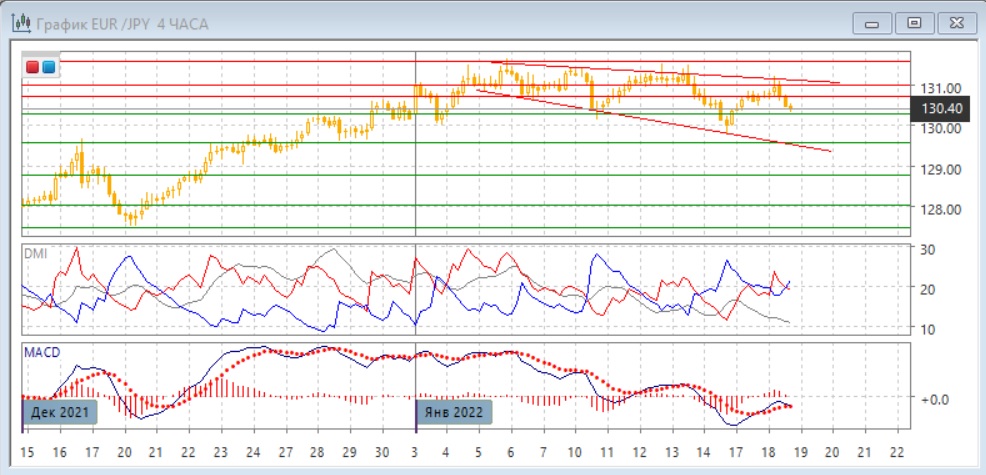 На четырёхчасовом графике можно представлять движение как диапазон с более широкими границами, 130,30-131,60, или как снижение в расширяющемся треугольнике. В снижение пары примерно с середины диапазона увеличивает вероятность выхода из него вниз. В рамках движения в треугольнике кара снижается от верхней границы выше 131,00 и целью тогда может быть уровень поддержки на 129,55. В любом случае, краткосрочно пара скорее будет тестировать поддержку на 130,30. По индикаторам направленного движения пара во флэте: ADX на очень низком уровне, DM+ и DM- близки, гистограммы MACD продолжает колебания около нуля, наклон линии MACD также меняется.
