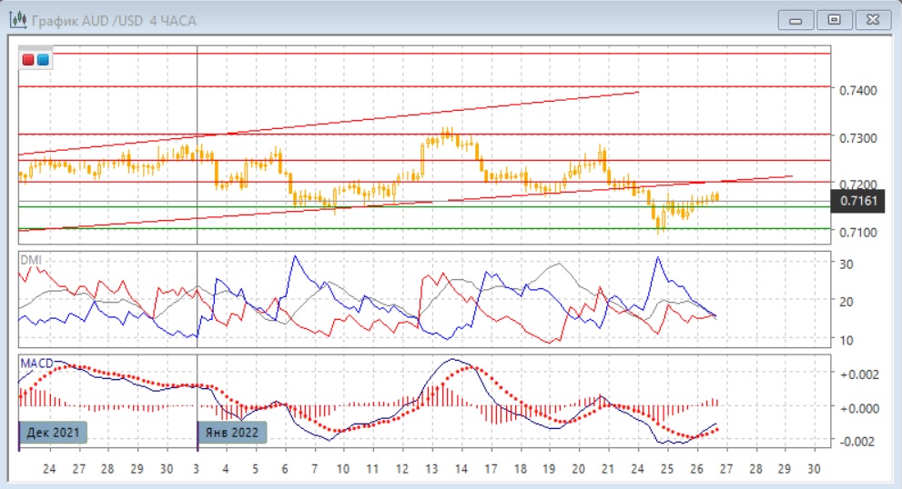 На четырёхчасовом графике пара восстановилась выше уровня 0,7150, теперь прорыв его 23-25 января может стать ложным, и это предполагает более высокую вероятность продолжения роста, пока пара остаётся выше 0,7150. Пока разворот вверх недостаточно убедителен: пара остаётся ниже ранее преодолённой линии тренда, она находится рядом к "круглым" уровнем 0,7200, что может укрепить сопротивление в этой зоне. Кроме этого, пока размер роста не выходит за пределы коррекции к снижению пары с 20 января. Поэтому необходимо более длительное отсутствие возобновления снижения.