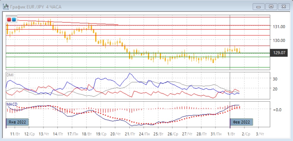 На дневном графике пара отскок приостановится около уровня сопротивления 129,55. Тенденцию снижения отскок вверх не нарушает, так как величина его небольшая по сравнению с размером волны снижения в январе. Однако то, что свеча была намного больше предыдущих, может быть бычьим сигналом. По индикаторам направленного движения коррекция к снижению: превышение DM- над DM+ сохраняется при относительно высоком уровне ADX, коррекция видна по росту гистограммы MACD.