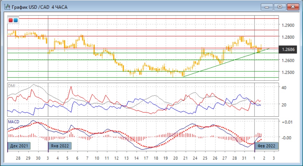 На четырёхчасовом графике пара находится у линии восходящего тренда, если строить её с 20 января. Также пара снизилась ниже "круглого" уровня 1,2700 и сейчас его можно рассматривать уже как ближайшее сопротивление. Поддержка на линии тренда усиливается уровнем 1,2655. Дальнейшее движение, вероятно, будет в сторону выхода либо выше 1,2700 (тогда целью виделся бы следующий "круглый" уровень 1,2800, либо ниже линии тренда и уровня 1,2655.