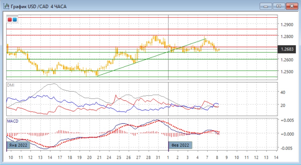 На четырёхчасовом графике пара снизилась от зоны, где сблизились линия тренда и от уровень 1,2800. Сейчас пара вернулась в узкий диапазон начала февраля 1,2655-1,2700. Дальнейшее движение, как и раньше, вероятно, будет в сторону выхода из диапазона - но сейчас более вероятное направление это снижение, так как в этом масштабе двойная вершина у 1,2800 вырисовывается лучше. Поддержка на 1,2655 в этом масштабе сильная, поэтому хотя более вероятно, что уровень будет продолжать тестироваться, риск отскока от этого уровня высок, и рассчитывать на снижение стоит при его преодолении - это подтвердит, что поддержка для пары стала недостаточной.