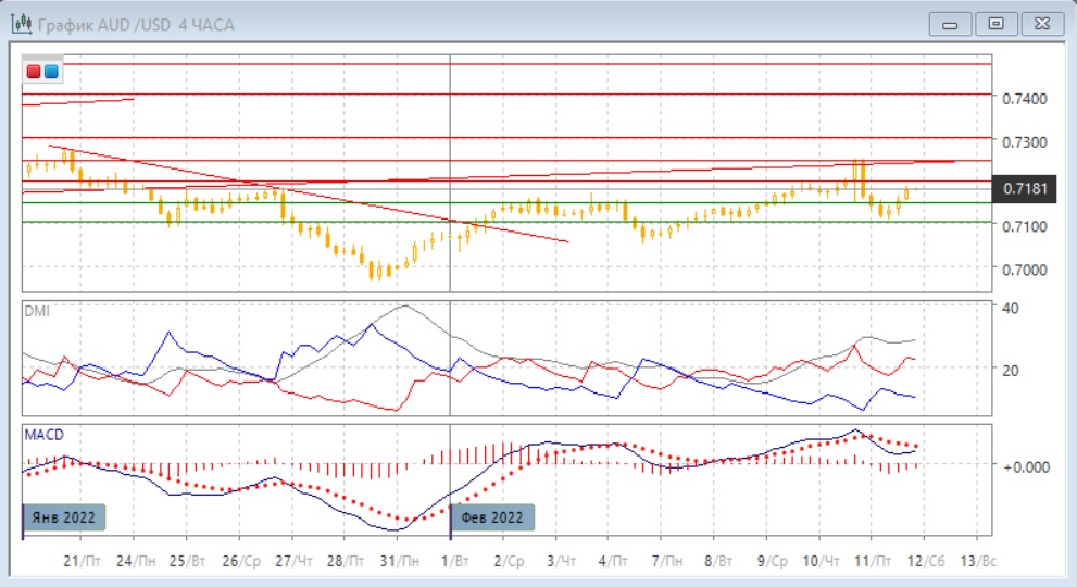 На четырёхчасовом графике пара получила поддержку на "круглом" уровне 0,7100 и преодолела ближайшее сопротивление на 0,7150. По индикаторам направленного движения тенденция роста в этом масштабе сохраняется: превышение DM+ над DM- остаётся высоким, коррекция видна по гистограмме MACD в отрицательной зоне и отрицательному наклону линии MACD. Пока пара выше 0,7150, в краткосрочной перспективе более вероятным видится рост к последнему максимуму на 0,7250.