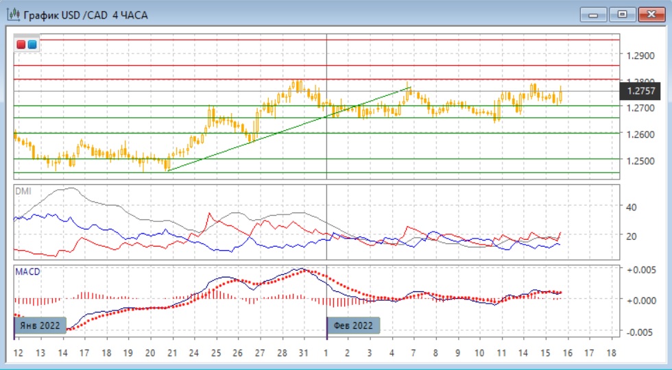 На четырёхчасовом графике пара остаётся в диапазоне 1,2655-1,2800. Пара приблизилась к верхней границе в понедельник, после чего снизилась до ближайшего "круглого" уровня 1,2700, где встретила поддержку. Исходя из движения в диапазоне, более вероятным кажется снижение, так как волна роста, кажется, завершилась. По индикаторам направленного движения флэт (что соответствует диапазону): DM+ и DM- близки, гистограмма MACD колеблется около нуля, линия MACD почти горизонтальна.