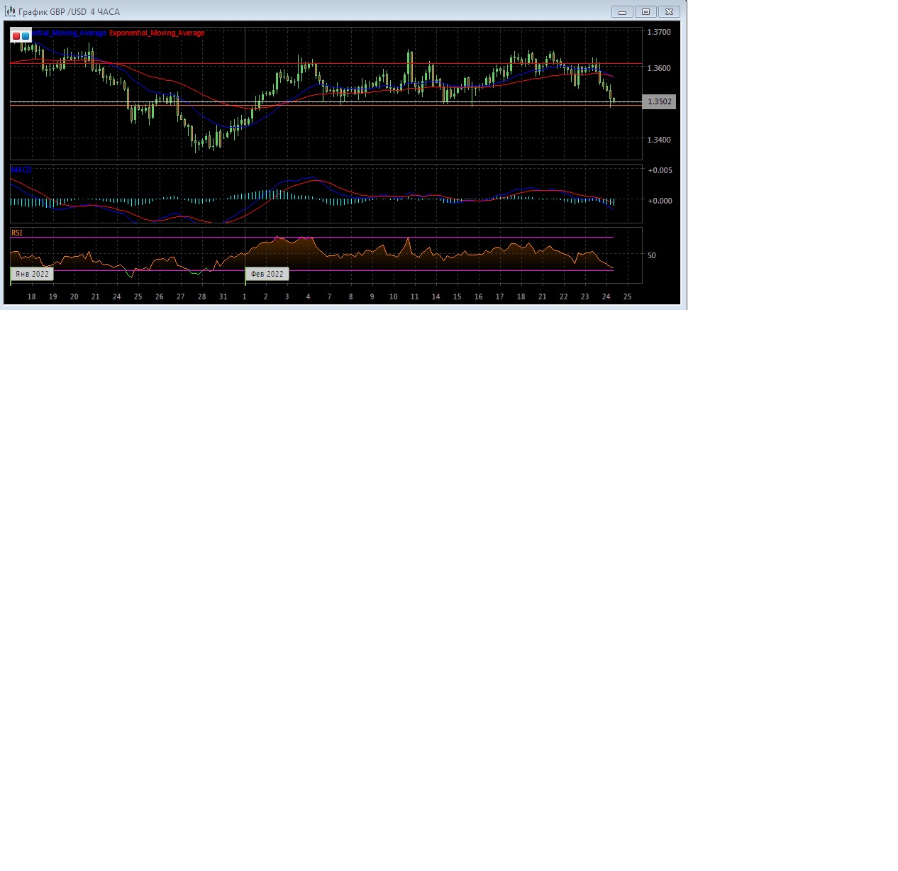 На четырёхчасовом графике скользящие средние развернулись вниз и сформировали сигнал на продажу и начали увеличивать расхождение, что свидетельствует о медвежьем тренде на этом рынке сегодня.