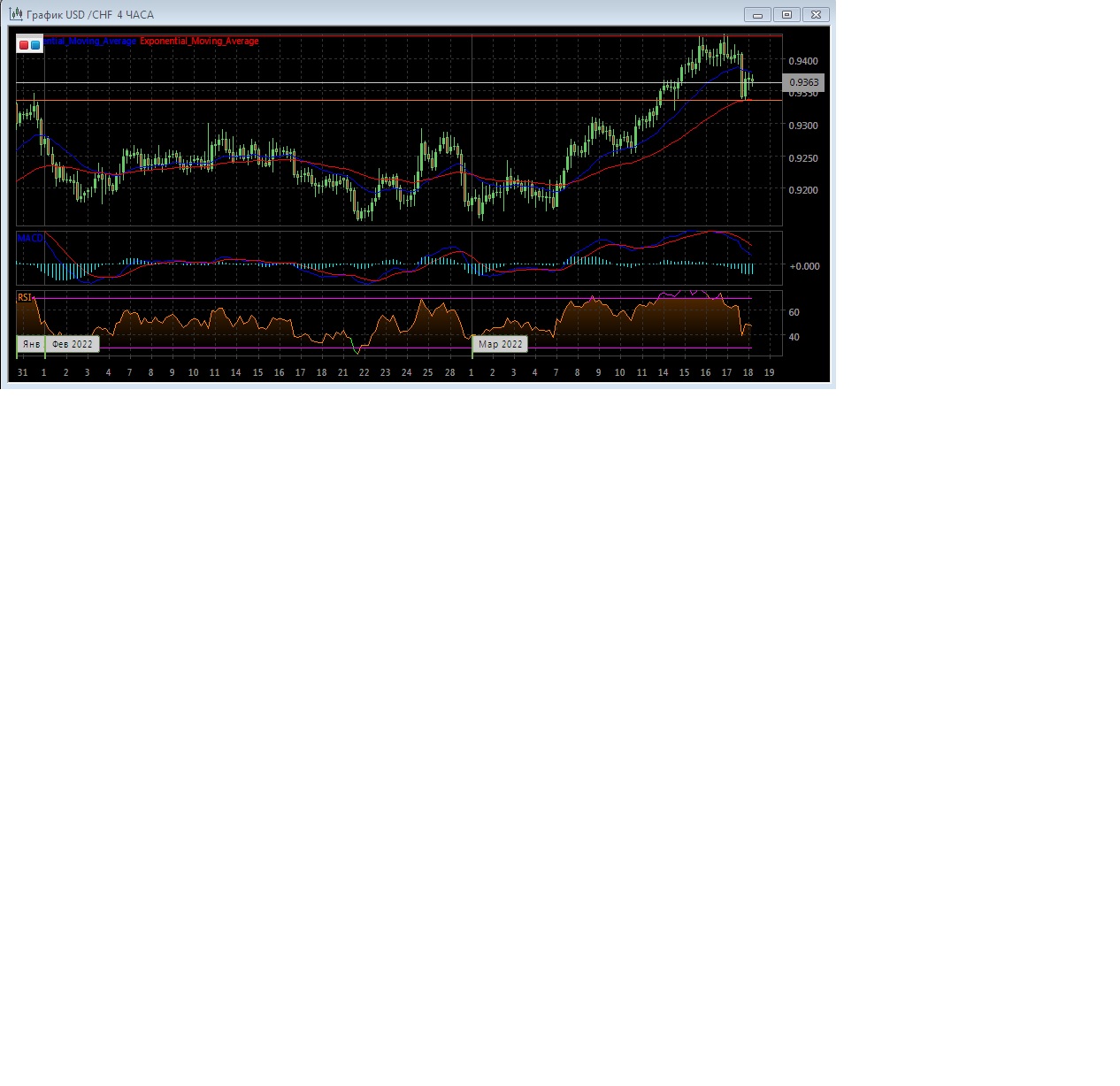 На четырёхчасовом графике скользящие средние с периодом 21 и 55 прекратили движение вверх и замедлились, сохраняя приличное расхождение, что демонстрирует окончание восходящего тренда на этом рынке. Четырёхчасовой график котировок развивается между экспоненциальных скользящих средних, свидетельствуя о смене потенциала данного рынка в краткосрочной перспективе.