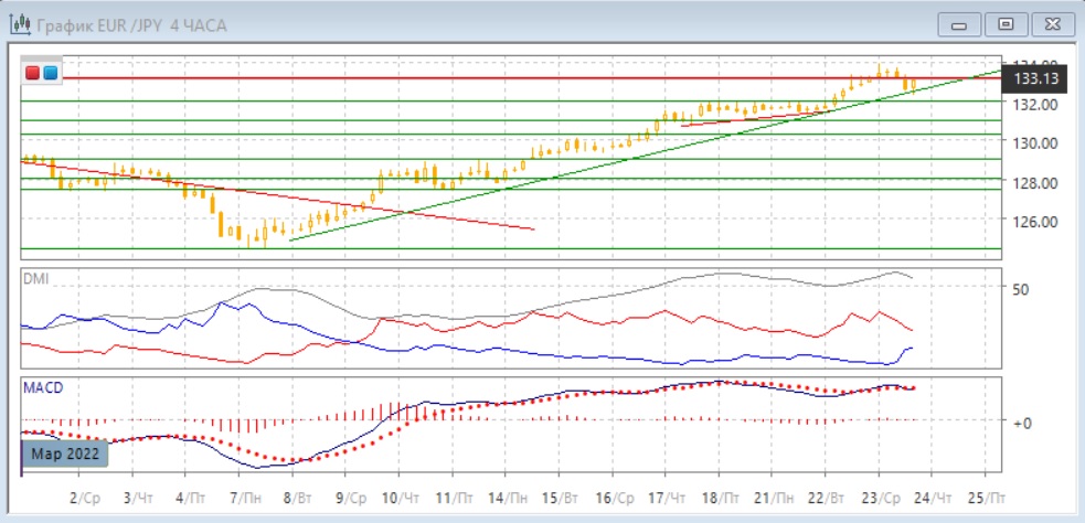 На четырёхчасовом графике пара вернулась к линии тренда с 7 марта. снижение от важного уровня сопротивления 133,25, образование ранее нескольких "падающих звёзд" увеличивает вероятность преодоления линии тренда, что может облегчить дальнейшее снижение (следующая сильная поддержка на 131,00). Ранее также образовалось очередное медвежье расхождение максимумов пары и гистограммы MACD, что укрепляет сопротивление на 133,25 и увеличивает вероятность отката. Пока пара остаётся ниже 133,25, в краткосрочное перспективе снижение кажется более вероятным, так как тренд скорее всего в фазе завершения.
