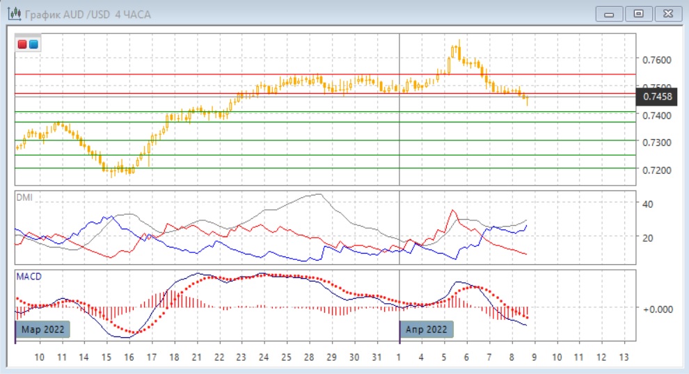 На четырёхчасовом графике пара преодолела уровень поддержки 0,7470. При отскоке пара может встретить сопротивление на 0,7470. По гистограмме MACD видно, что снижение замедляется - уровень MACD повысился. При этом по ADX тенденция снижения усилилась: превышение DM- над DM+ увеличилось, уровень ADX вырос. Относительные максимумы и минимумы пары последовательно снижаются, это показывает краткосрочную тенденцию