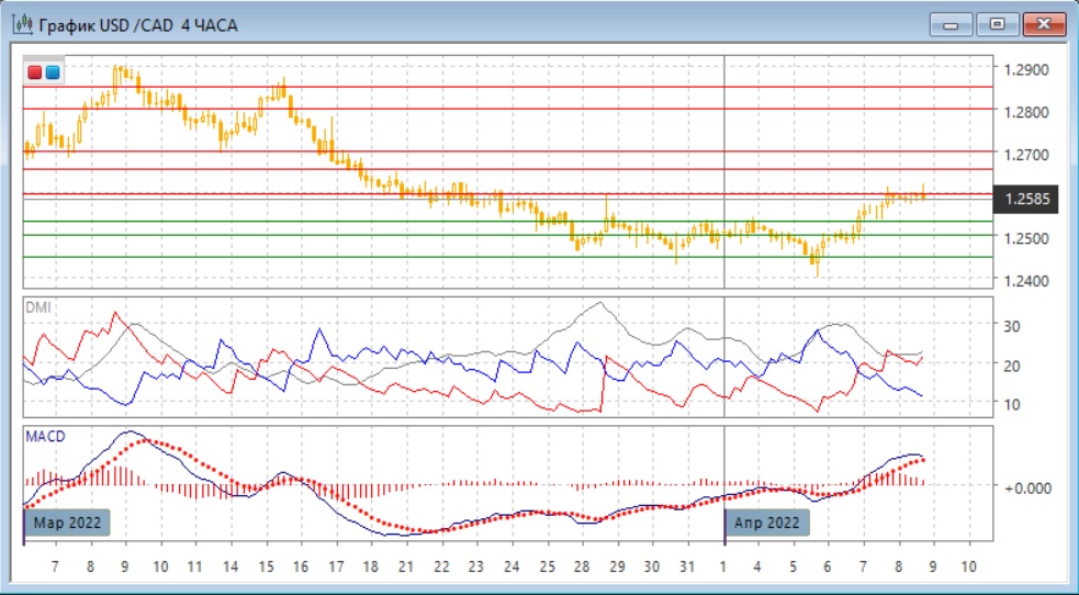 На четырёхчасовом графике пара перешла к росту, относительные максимумы и минимумы пары сейчас растут. По индикаторам направленного движения тенденцией также стал рост: DM+ выше DM-, гистограмма MACD находится в положительной зоне, линия MACD имеет положительный наклон. Сейчас тестируется сопротивление на "круглом" уровне 1,2600. При его преодолении пара может достичь следующего "круглого" уровня 1,2700. При откате поддержу можно ожидать на 1,2530.
