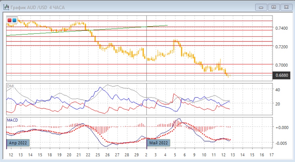На четырёхчасовом графике пара преодолела уровень минимумов 10 мая немного выше 0,6900 и сам этот уровень. Таким образом, коррекционное движение вверх завершилось и снижение продолжилось. В этом масштабе также имеется бычье расхождение минимумов пары и гистограммы MACD. При восстановление выше 0,6900 это может быть подтверждением сигнала и тогда пара может вернуться к 0,7000 (так как она вернулась бы в узкий диапазон, из которого вышла). Однако пока пара ниже 0,6900, продолжение снижения в краткосрочной перспективе кажется предпочтительным.