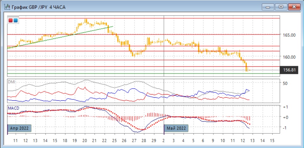 На четырёхчасовом графике снижение ускорилось после преодоления минимумов мая и конца апреля около 160,00. В результате пара вышла из диапазона и тенденцией стало снижение. По индикаторам это видно по увеличению превышения DM+ над DM-, снижению гистограммы MACD в отрицательной зоне, отрицательному наклону линии MACD. Замедления снижения сейчас не видно, и более вероятным кажется, что оно продолжится.