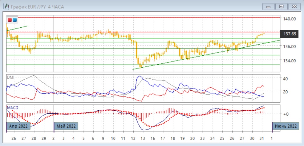 На четырёхчасовом графике пара вышла вверх из треугольника, образованного линией тренда и уровнем 137,00. Таким образом, учитывая размер треугольника, вереди может быть существенный рост. По индикаторам направленного движения тенденцией становится рост: DM+ увеличивает превышение над DM-, гистограмма MACD растёт в положительной зоне, линия MACD имеет положительный наклон. Пара уже достигла сильного уровня сопротивления на 138,00. При его преодолении до 140,00 сильного сопротивления не видно.