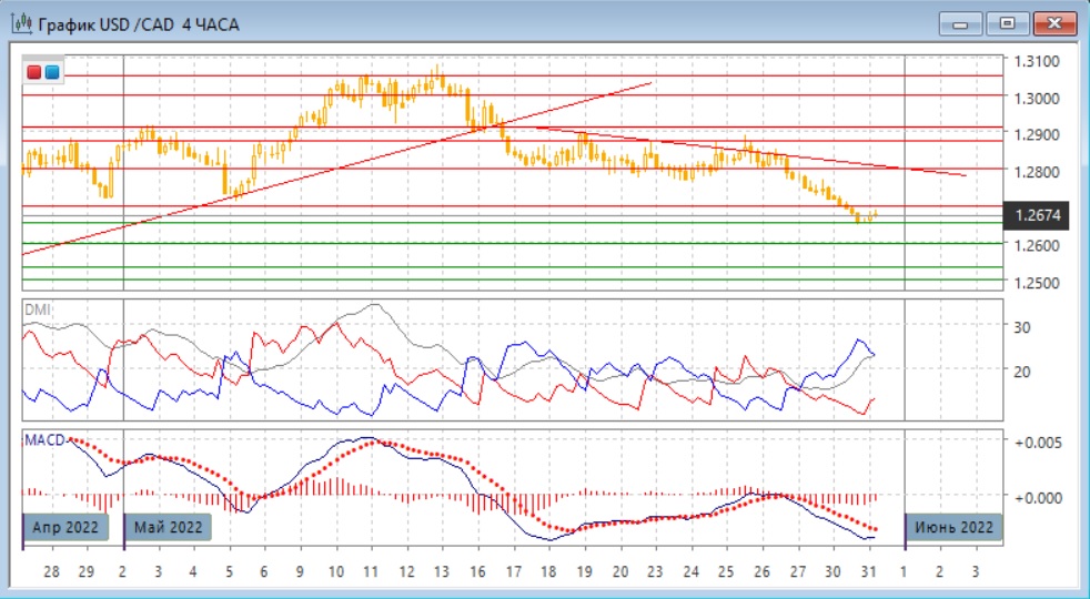 На дневном графике снижение продолжится после преодоления "круглого" уровня 1,2800, и при возвращении пары в широкий диапазон 1,2450-1,2850. Если движение выше верхней границы в мае рассматривать как ложный пробой, то возвращение к нижней границе диапазона делает потенциальной целью нижнюю границу на 1,2450, что примерно соответствует поддержке на психологически важном уровне 1,2500. Ускорение снижения при закрытии ниже 1,2800 является медвежьим сигналом.