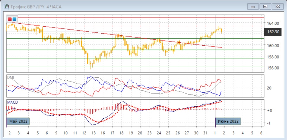 На дневном графике пара продолжила рост после преодоления нисходящей линии тренда с начала мая. Пара достигла более высокого относительного максимума, и остаётся выше зоны поддержки около 160,00 (рядом находится линия тренда), где можно ожидать поддержки в случае отката. По индикаторам направленного движения тенденцией становится рост: превышение DM+ над DM- становится видно лучше, хотя ADX остаётся на низком уровне. Гистограмма MACD растёт в положительной зоне, линия MACD имеет положительный наклон.