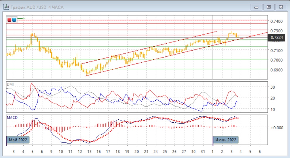 На дневном графике пара осталась в восходящем канале с середины мая. Важным является закрытие выше следующего "круглого" уровня 0,7200 и то, что пара остаётся выше него. Сейчас она тестирует важный уровень сопротивления на 0,7250. Преодоление этого уровня облегчило бы дальнейшее движение, так как следующая сильная поддержка только на 0,7400. Как и ранее, повышает вероятность отката большая величина волны роста без существенных откатов, а также и длительность (движение в канале началось с середины мая). По индикаторам направленного движения тенденция роста усиливается: превышение DM+ над DM- увеличилось, уровень ADX, хотя остаётся низким, вырос, гистограмма MACD находится в положительной зоне, линия MACD имеет положительный наклон.