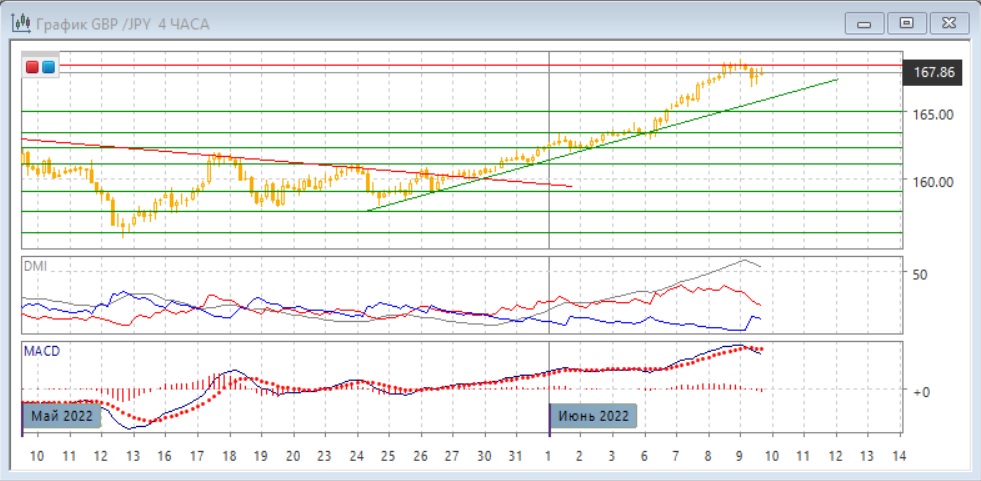 На четырёхчасовом графике у сопротивления на 168,40 образовалась хорошо выраженная вершина, хотя откат не получил развития, что видно по нижним теням последних свечей. Это не меняет тенденции роста, так как откат был давно назревшим - с 6 июня заметной коррекции не было, и пара далеко оторвалась от линии тренда, если строить его с конца мая. По индикаторам направленного движения - коррекция к росту: коррекция видна по снижению гистограммы MACD в отрицательной зоне и развороту линии MACD, сохранение тенденции - по превышению DM+ над DM-, которое сохраняется. При откате пара может получить поддержку на линии тренда.